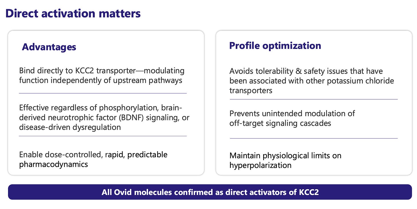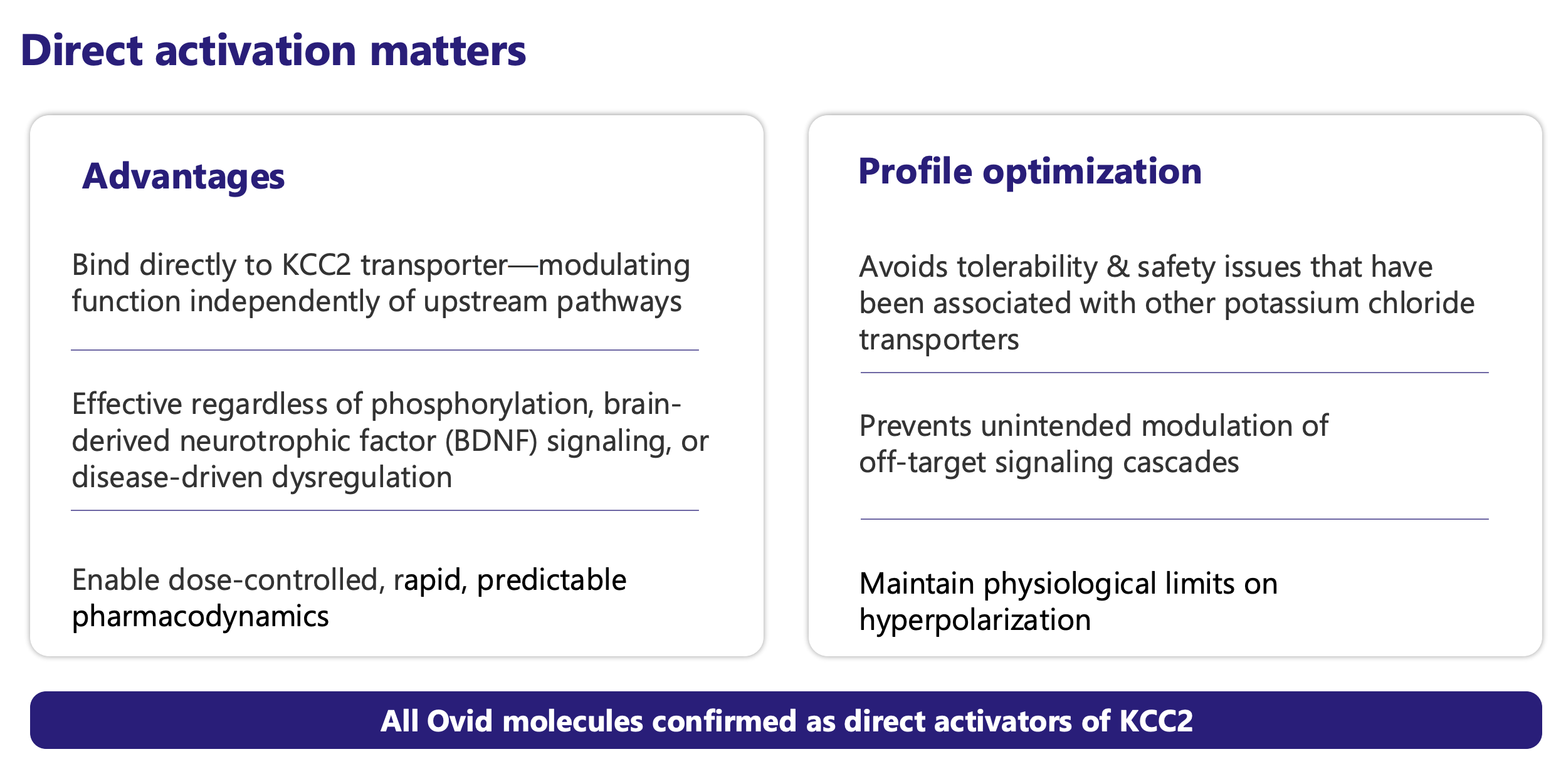This downside protection makes investing in OVID for the KCC2 programs even more interesting. OVID is developing several KCC2 activators, including OV350 (IV) and OV4071 (oral). KCC2 is a neuron-specific chloride extruder - a “master switch” for neurological disorders that restores excitatory/inhibitor homeostasis. OVID thinks it is an ideal target because it (1) cannot be pushed beyond electrochemical equilibrium, (2) it has self-limiting activation, and (3) expression is confined to the CNS - all of which support potential long-term safety with chronic use.