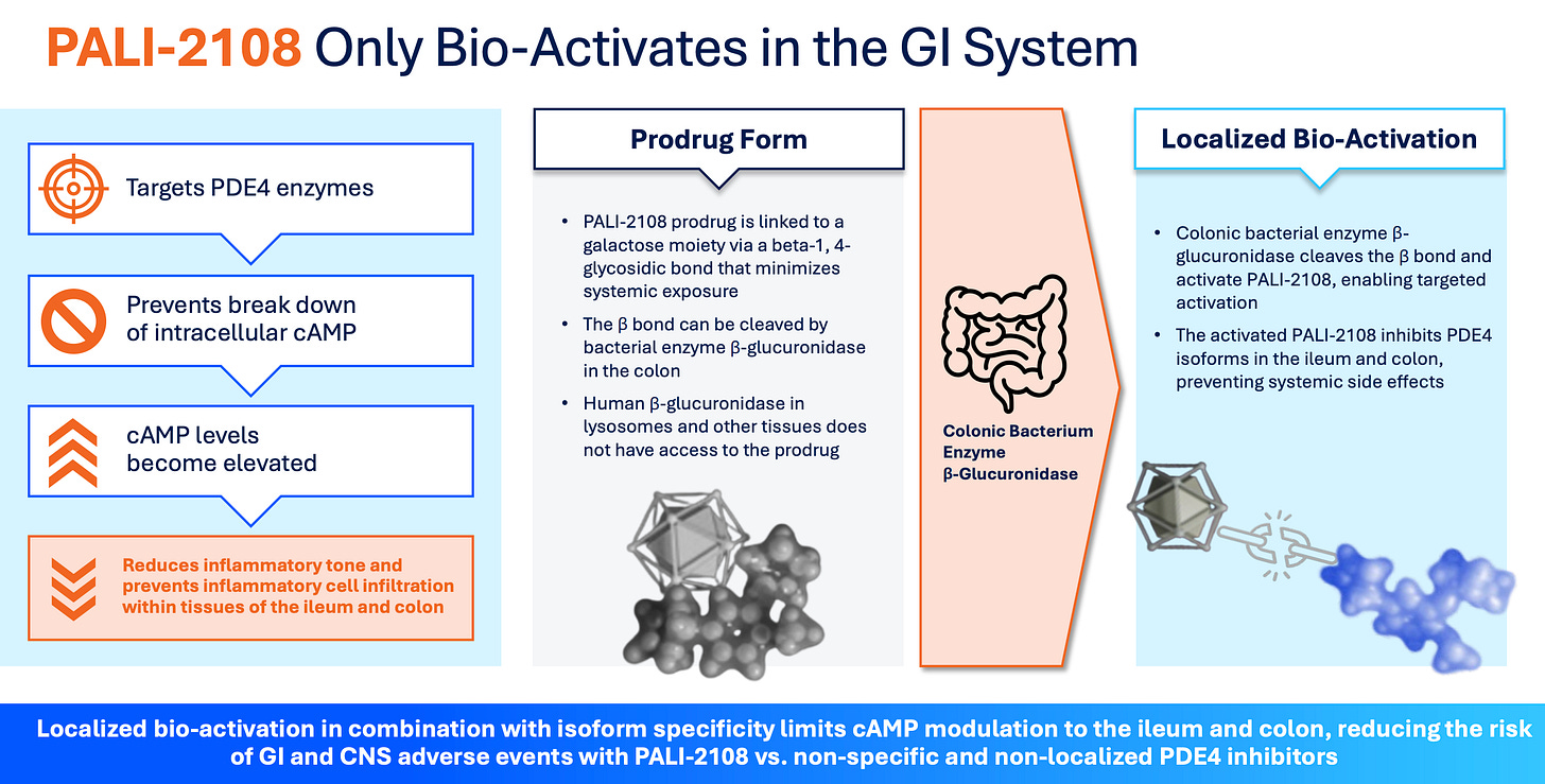 PALI’s drug is a colon-activated, specific PDE4 with a long half-life. They aim to mitigate systemic side effects by inactivating the drug, which only becomes active (releasing the active PDE4 inhibitor) upon cleavage by a bacterial enzyme (β-glucuronidase) in the colon. Initial Phase 1 data, which show low systemic activity and high fecal activity, look very encouraging. And it’s oral, so that’s where the Abivax comparison comes into play. Based on what we know to date, I’m confident PALI-2108 will work in UC. A Phase 2 study should begin around mid-2026. Before that, we will see data from a Phase 1b study in fibrostenotic Crohn’s Disease (FSCD) in Q1 2026. This will hopefully show anti-fibrotic biomarkers and downregulation of inflammatory cytokines. I ultimately think PALI might fail in FSCD, but as long as the Phase 1b data are directionally positive, it would help de-risk Phase 2a in UC, which would be the next major catalyst for the stock.
