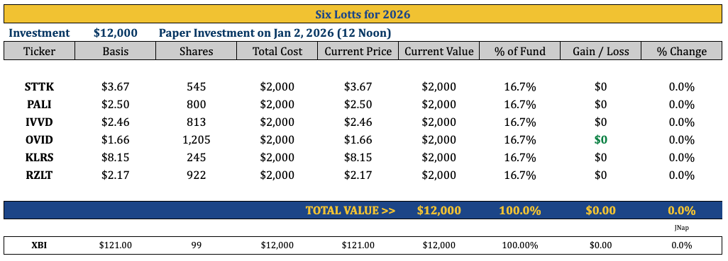 Before we get going, let me remind you of the ground rules! First, investing in biotech stocks is difficult, so be smart about your “lotto” allocation! I’m more likely to go “Oh for 6” on these ideas than “6 for 6”. For example, at one point last year, my “Five for 2025” picks (CMRX, LRMR, RZLT, KALA, and ZNTL) were all winners, with RZLT, KALA, and CMRX each up well over 100%. In fact, at one point, the entire portfolio was up over 150%, driven by substantial gains in RZTL and KALA. Both failed pivotal clinical trials, and we ended the year flat - only CMRX (acquired) was a big winner. I recommend allocating no more than 12% of our portfolio to these lotto ideas. My second point is that some of these names will take more than 12 months to play out. I’m calling this “Six for 2026,” but I think you should consider the default holding period on these through year-end 2027. Point three: all ideas are exchange-listed, and nothing is under $1/sh.