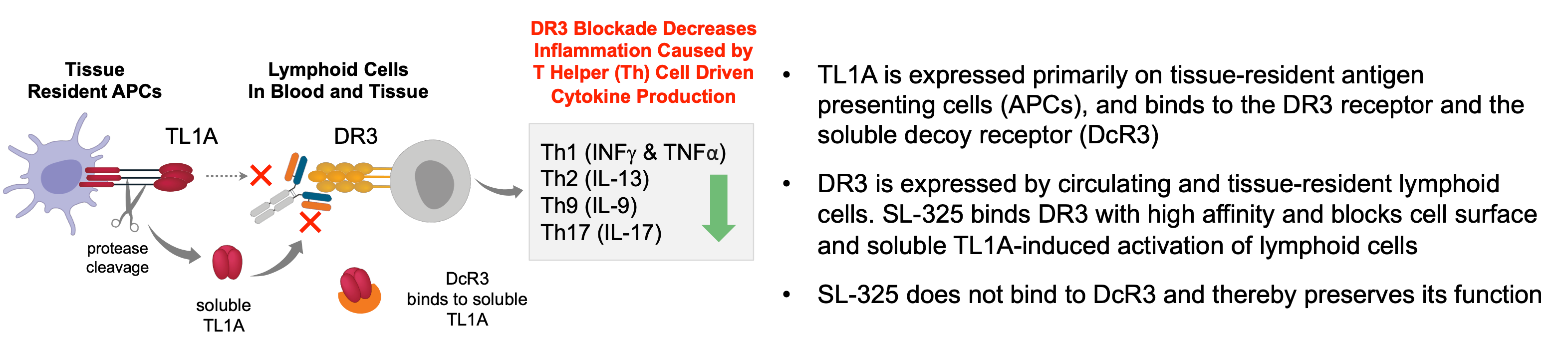 STTK is developing SL-325 for the treatment of inflammatory bowel disease (IBD), which includes both Ulcerative Colitis (UC) and Crohn’s disease (CD). The concept here is simple: blocking TL1A works. This is clinically validated by Merck’s tulisokibart (acquired via the Prometheus acquisition for $10.8 billion) and Roche/Pfizer’s RVT-3101 (Roche paid ROIV $7.1B for U.S./Japan rights, Pfizer has RoW rights). Sanofi and Teva are also in Phase 3 with duvakitug. TL1A is the ligand on APCs that binds to the receptor, DR3, on lymphocytes. TL1A signals only through the DR3 receptor, so it is highly plausible that targeting either will yield similar efficacy and specificity. However, TL1A also binds to a decoy receptor (DcR3) that naturally regulates (mops up) soluble TL1A. STTK believes targeting the receptor will result in better tolerability (lower or no formation of immune complex because it is membrane-bound) and higher potency because: 1) It leaves the (natural) decoy active, and 2) DR3 is stable on the lymphocytes (always there) and not “a moving target” like TL1A only on inflamed tissue. STTK also engineered SL-325 to have a silent Fc to prevent T cell killing through ADCC.