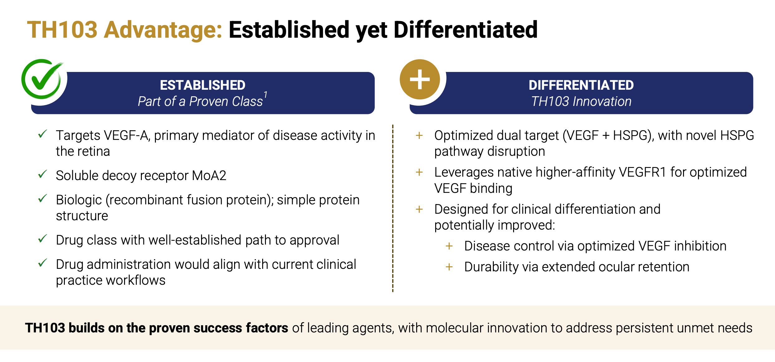 TH103 is a next-generation VEGF “trap” built from VEGFR1 domains 2 and 3, designed to sequester VEGF-A more tightly by leveraging VEGFR1’s ~10× higher native binding affinity for VEGF-A versus VEGFR2. Unlike Eylea (aflibercept), which uses VEGFR2-D3, TH103 incorporates VEGFR1-D3 - a major heparan sulfate proteoglycan (HSPG) binding site - potentially anchoring the drug within vitreous/retinal matrices to extend intraocular residence and durability. If this translates clinically, the combination of tighter VEGF neutralization and increased local retention through HSPG could support longer dosing intervals compared with current anti-VEGF agents, including Roche’s Vabysmo (faricimab), which is on pace to generate approximately $5 billion in sales in only its third year on the market.